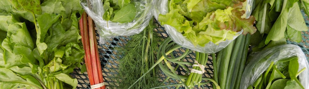 Hanging out in the box with the scapes are leaf lettuce, spinach, arugula, more head lettuce, green onions, Swiss chard, rhubarb, bok choy, some beautiful dill weed, AND the first of the beets. Today’s mix contain the ever sweet Golden Beets and beautifully stripped Chioggia Beets. There are only a few as I had to scrounge to find enough sizable ones but they are a great hint of what is to come. This time of year the tops are also exquisitely tasty. They can be juiced, steamed, creamed or cooked up in this tasty rendition. There will be plenty of beets spaced through out the season including red ones, striped ones, golden ones, and cylindrical ones. This small taste is just tease of what is yet to come.