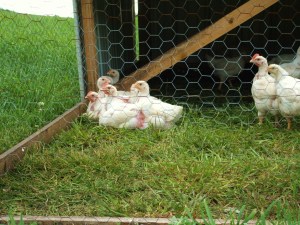 For meat we raise Cornish rock broilers in chicken tractors using the Joel Salatin method. The broilers are moved daily to a new patch of grass and fed a supplemental grain diet. Broilers are available periodically during the summer. Orders are preferred and suggested as we only grow what we need to and quickly sell out.